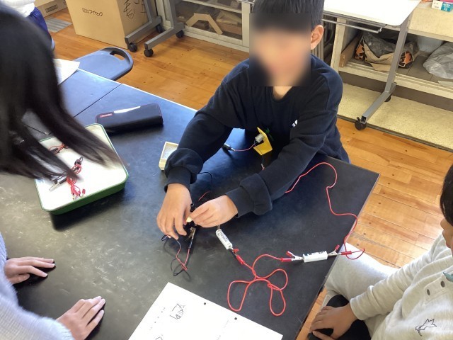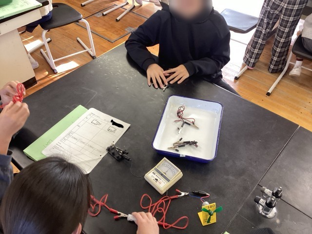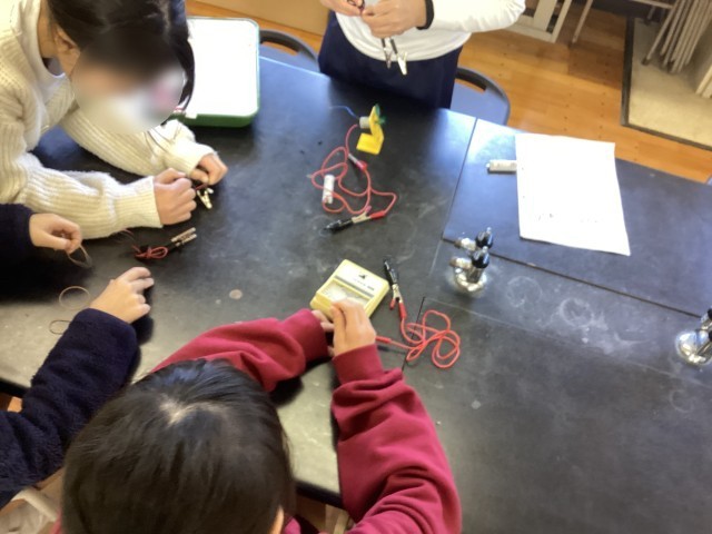 5学年の理科では、4年生の復習をしました。自分たちで、直列回路をつくり簡易検流計で電流の大きさと向きについて調べました!