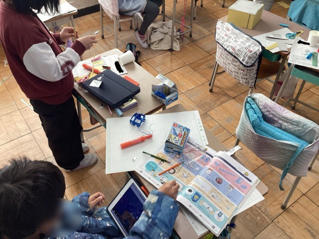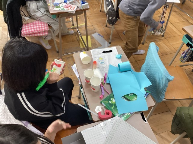 3学年の理科では、電気の学習のまとめとして、自分で設計したおもちゃをつくりました。まだ途中ですが、徐々に完成に近づいています!