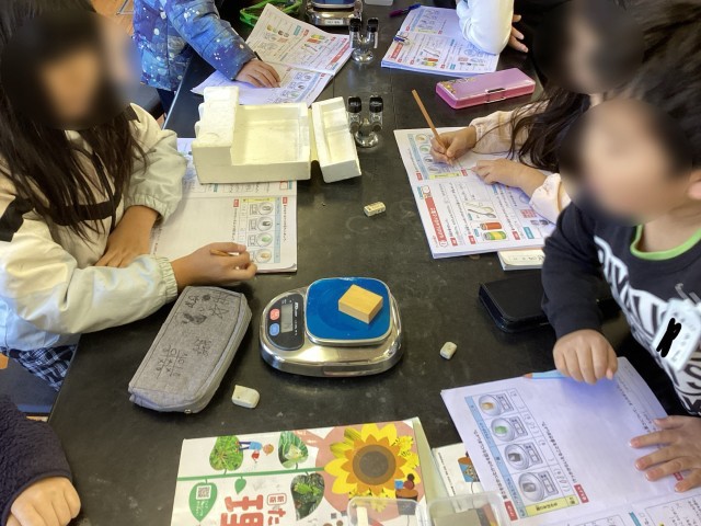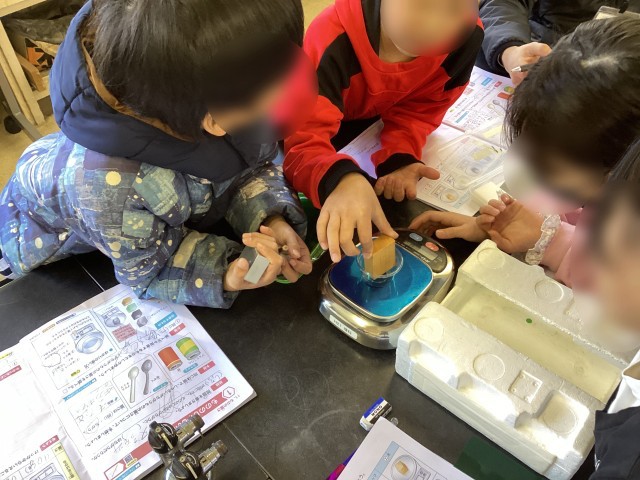 3学年の理科では、物の種類と重さのちがいについて学習しています。今回は、電子てんびんの使い方を学習し、種類のちがうものを量りました。
