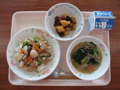 11月18日(月)今日の給食は、豆腐と野菜のあんかけごはん、レバーのかりんとう揚げ、わかめのみそ汁、牛乳です。