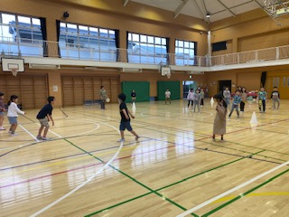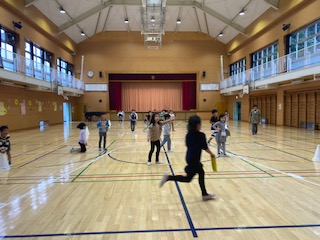 2年生が体育館でドッヂビーをしています。