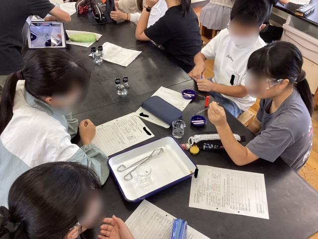 理科では、身近な水溶液(本日は食塩水と炭酸水)の特徴と性質について調べました。リトマス紙を使ったり、加熱をしたりしてちがいをくらべました!