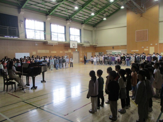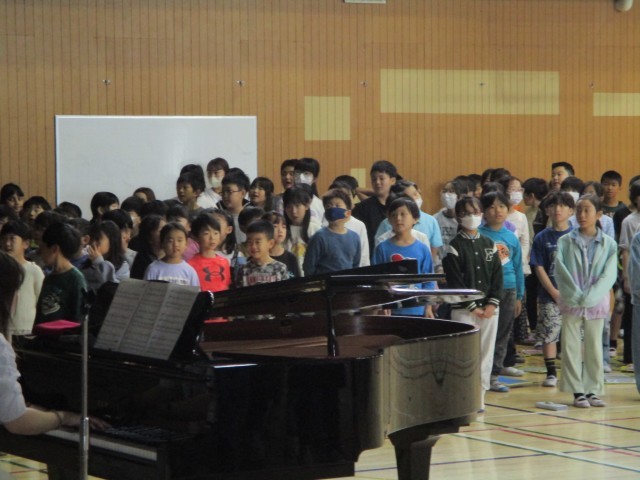 マイバラードを全校で歌いました。みなみフェスのスローガン「心をひとつに がんばろう 十人十色の みなみっ子」のもと楽しく歌うことができました。