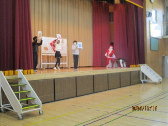 今日は、集会委員会による劇を行ないました。面白おかしく仕立てられらた台本をもとにみんなで楽しい時間を過ごすことができました。あと6登校日ですが、ずいぶん寒くなってきましたので、体調を崩さず楽しく過ごしてほしいです。