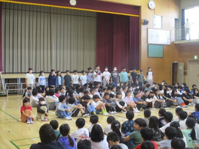 7つの委員会が、それぞれの委員長・副委員長の児童から全校児童へ、活動内容の紹介をしました。高学年らしい立派な姿でした。
