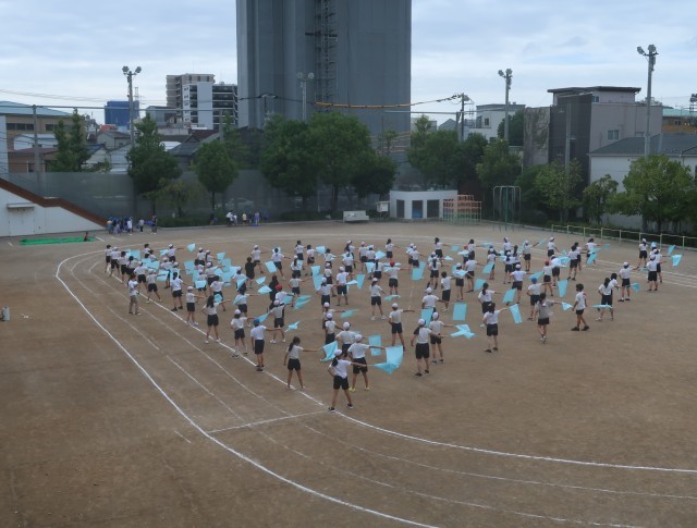 今日は涼しく、校庭の練習も快適に行うことができます。6年生が、水色のフラッグを持って校庭へ出てきました。隊形を確認しながら、移動できるよう練習しています。本格的な練習が始まってきました。