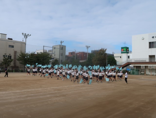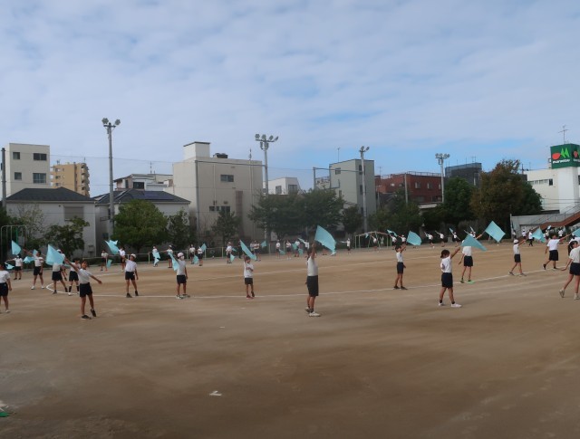 6年生の演目が完成に向かっています。フラッグのたなびく音が、「ビュン」と鳴り合わせるかっこよさ!フラッグを効果的に使って、会場を盛り上げますね。