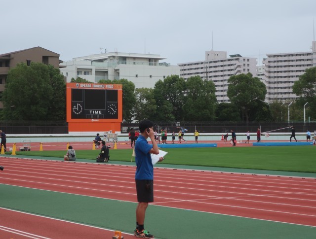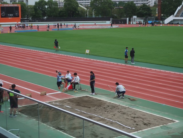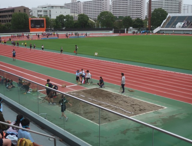 フィールドでは、走り高跳び、走り幅跳びが行われています。練習の成果を発揮しようと、選手たちが躍動しています。