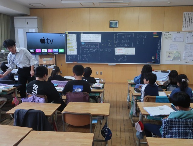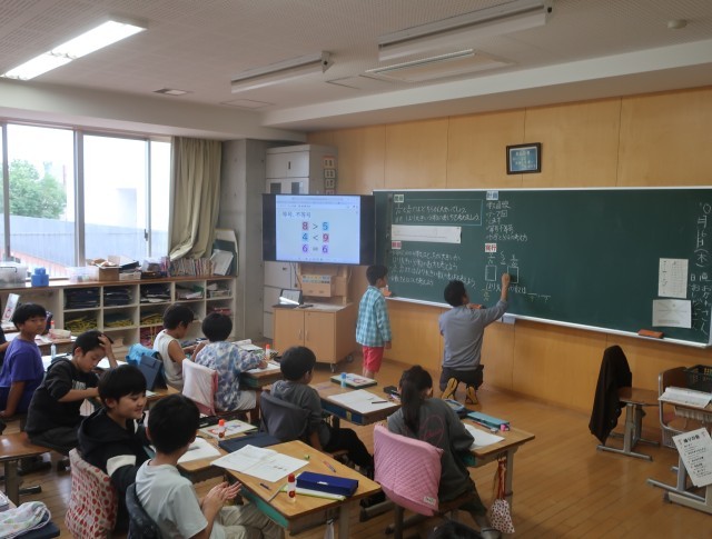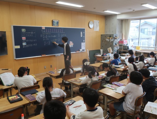 3年生が研究授業を行いました。算数の単元「分数」です。分数は分母を合わせなければ比べることができません。分母を合わせて、比べると、どちらが大きいのかわかります。子供たちが、分母を等しくすることが必要で、分母を等しくして比べることがわかるように授業を行いました。3年生のどのコースも、みんなが「わかろう」と真剣に学習に取り組んでいました。