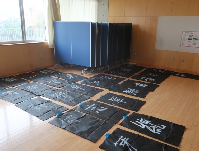 4年生の法被に文字が入りました。様々な思いを込めて文字を書き入れました。当日は、4年生の演技はもちろん、背中の文字にもご注目ください!