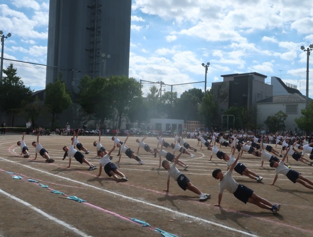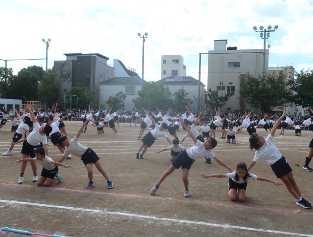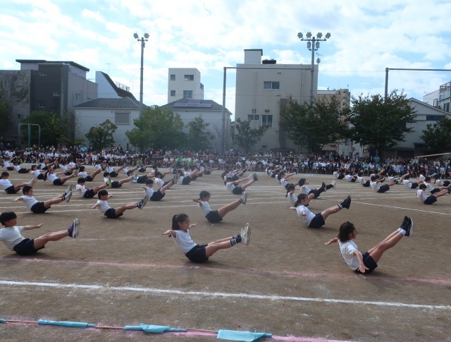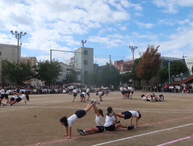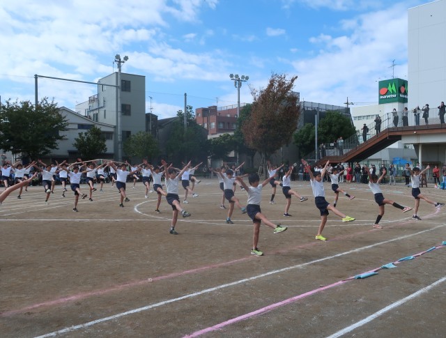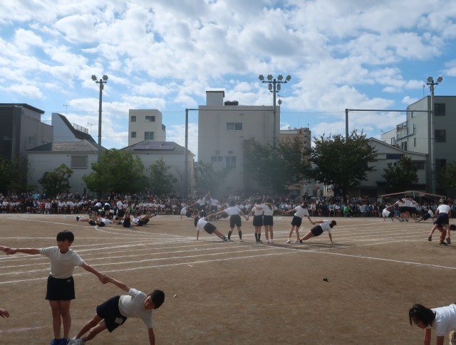 フラッグを置き、自分の体を精一杯使ってのパフォーマンスです。指先を伸ばすところ、友達と協力して合わせ技をするところ、どれもが緊張感をもっての演技です。「せえーの!」の掛け声で、花開く表現は、気持ちが伝わってくれだけに、鳥肌が立ちました。