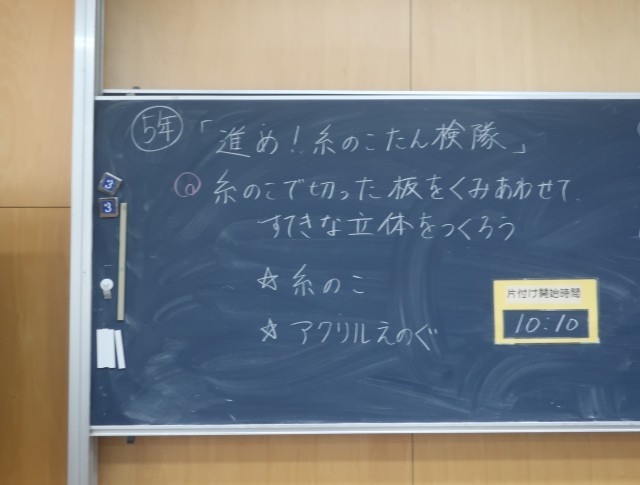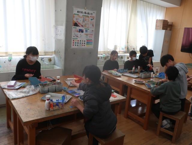 糸のこで切った木を組み合わせて立体を作っています。組み合わせはパズルのように、くぎを使わず合わせています。色も塗ってすてきな形に仕上げていきます。
