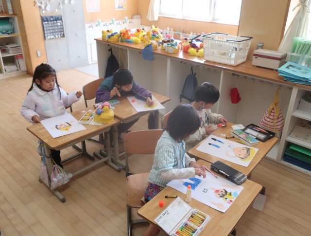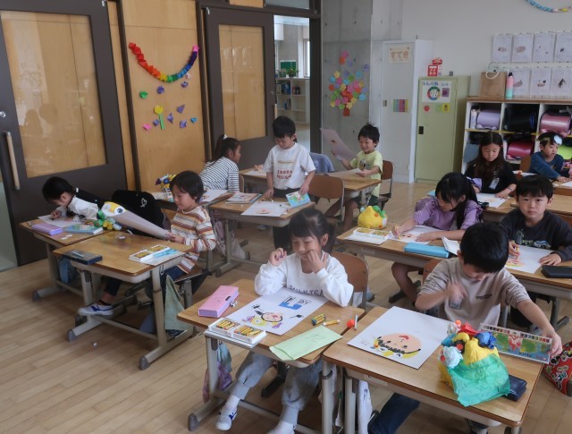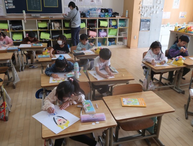「かわいいだけじゃ、だめですか?」のかわいいダンスを披露してくれた1年生が、スポフェスの思い出を絵に表しています。怪獣帽子をかわいくかいてお気に入りのポーズを決めたところをかいています。