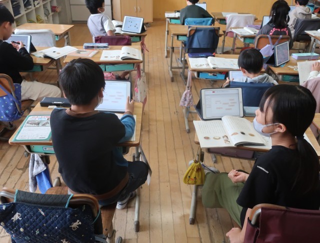 大豆の使われ方について、叙述を手掛かりにして読んでいきます。タブレットも使って、大豆がすがたを変える様子をまとめています。すがたをかえる大豆のひみつは、叙述に即して読むとよくわかりますね。