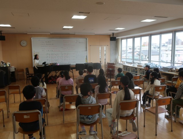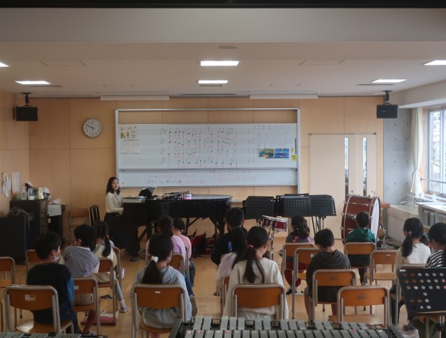 歌を歌う時の姿勢に気を付けて、ふじ山の楽譜を見ながら歌っています。楽譜を見ると、音が上がっているところがわかります。上がっている時には、どんな様子で歌うとよいのでしょう。メロディを大切にして歌う楽しさを実感していました。