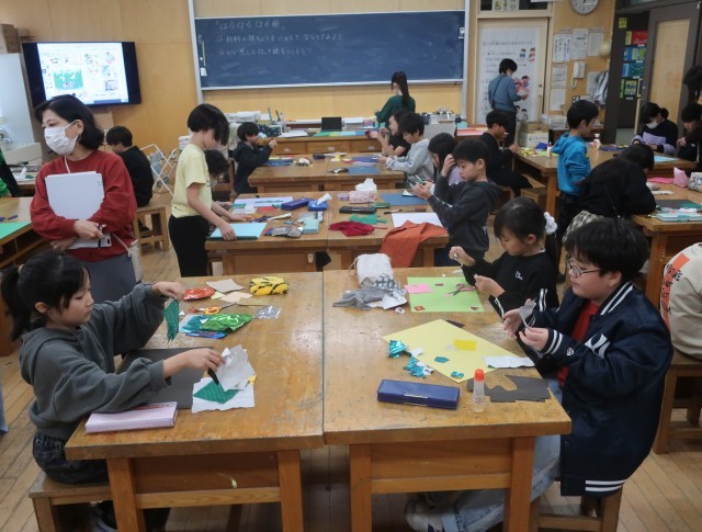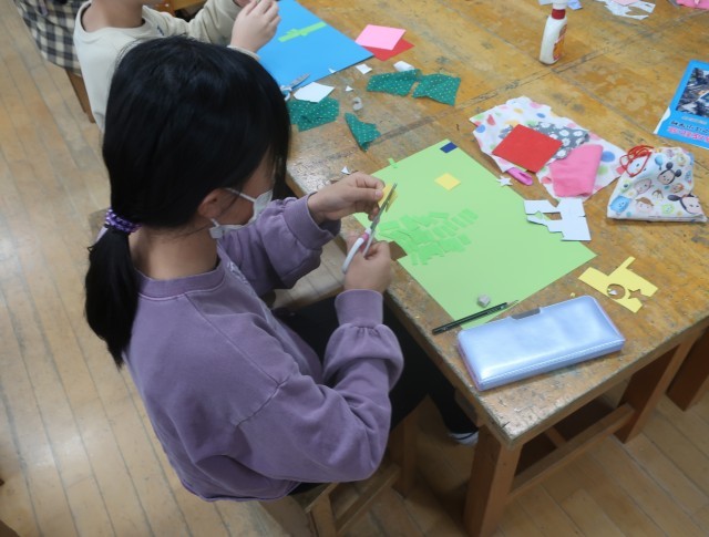 使い残した画用紙や、古い布切れなどの廃材を活用して、「貼る」だけで作品を作っていきます。形も色も揃っていない紙や布を貼り合わせると、すてきな作品ができあがるのです。構成を考えて画用紙に配置する子、まずは貼ってみて整えていく子、それぞれ貼ることでいろいろな作品ができあがってきました。