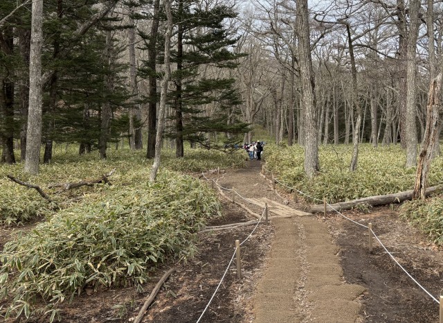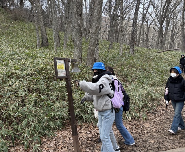 さあ、戦場ヶ原ハイキングへ出発です。みぞれが舞う寒い中ですが、元気に歩き始めました。途中、熊よけのベルを鳴らして、歩いています。