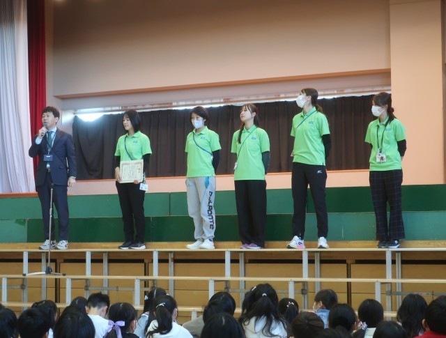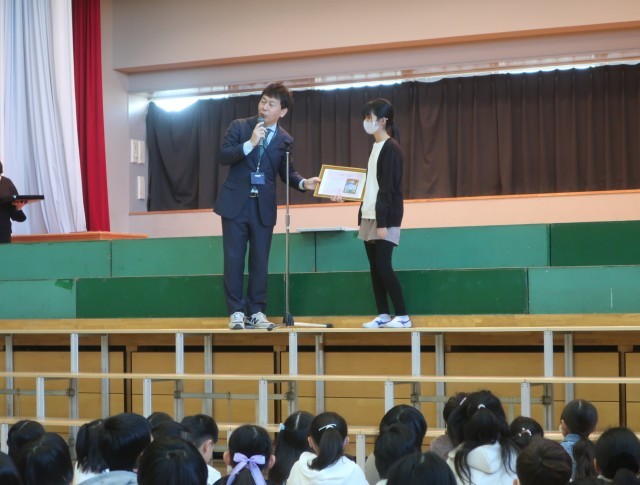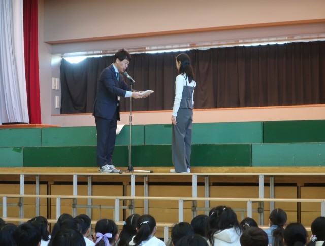 そして、先生方も表彰しました。東京都の女子バレーボール大会で3位になりました。チームワークで、松江小学校の仲間として戦い抜きました。おめでとう!