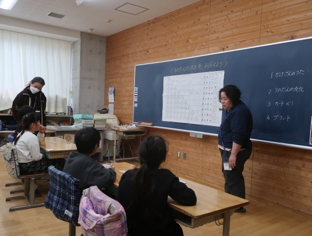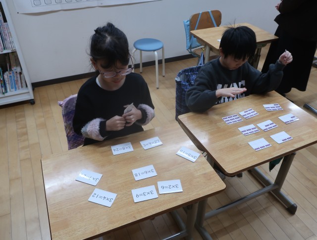 わかば学級は、算数の学習をグループで行っています。3組グループは、かけ算を学習しました。かけ算の歌をみんなで歌い、3の段のかけ算のカード取りをしました。かけ算を唱えながら遊びを通して学習をしています。