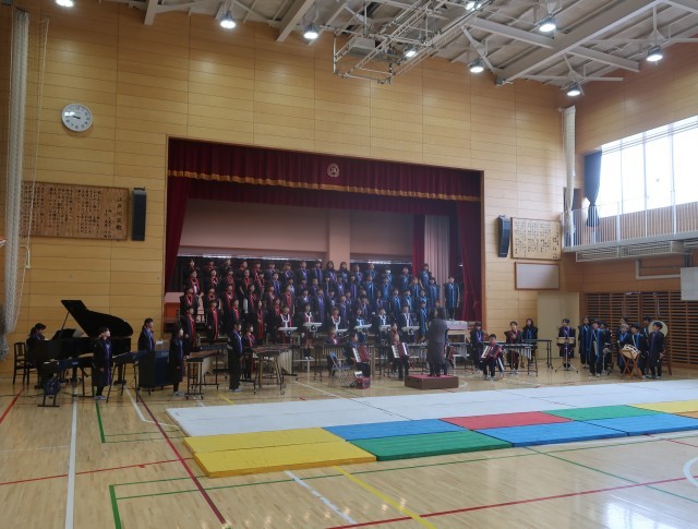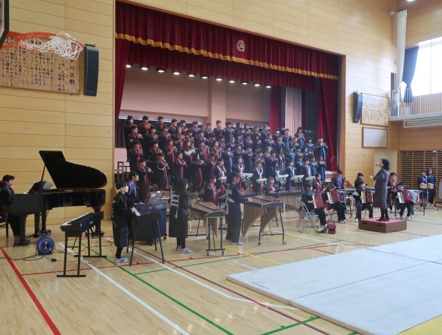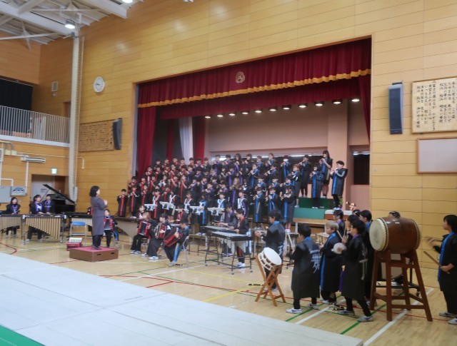 4年生の勢いある舞台発表のリハーサルです。スポーツフェスまつえで着用した法被を着ての登場です。体全体を使って、リズムを取りながら歌って踊る4年生をご期待ください。