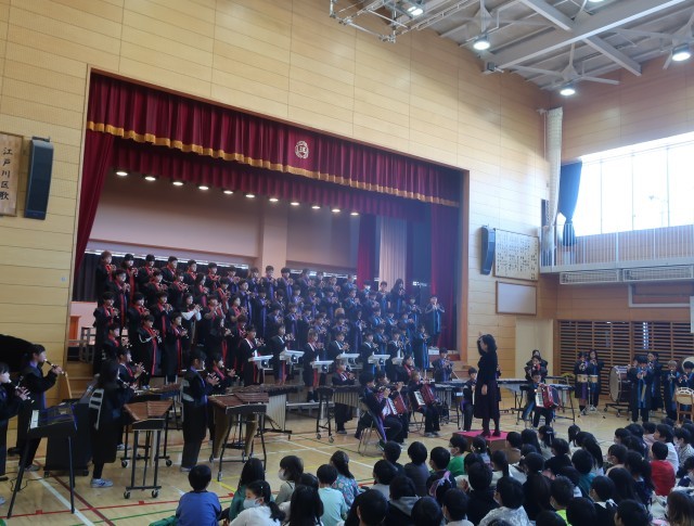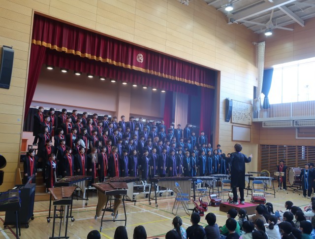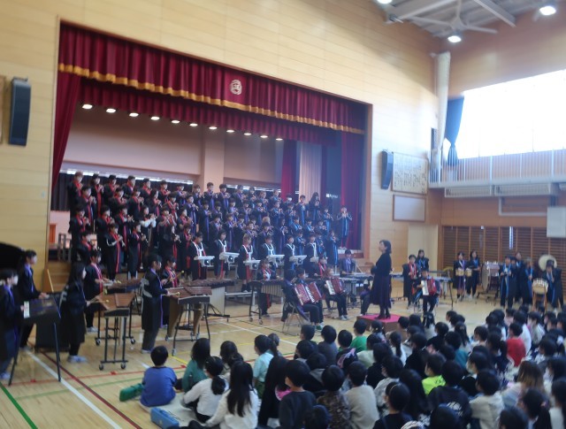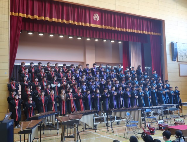 続いては4年生です。松江小学校に祭りがやって来ました!祭りばやしにのって、4年生の元気と力強さをを伴う演奏を見せてくれました。会場からは、思わず手拍子したくなるリズムに祭りの楽しさが伝わってきました。