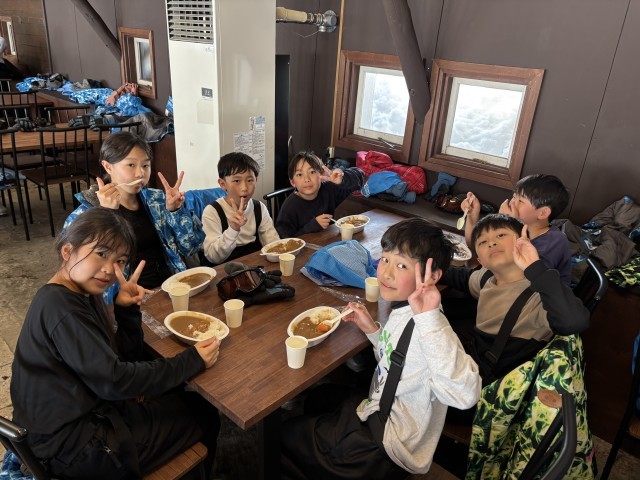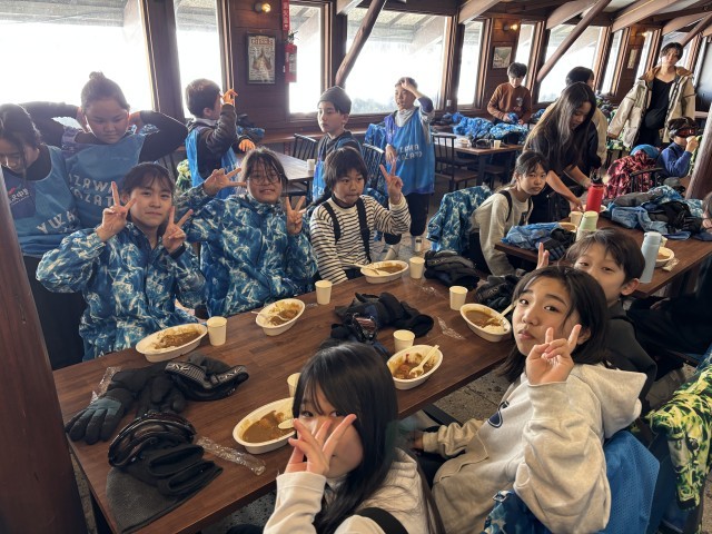 午前のスキースクールが終了してお昼になります。お昼はカレーライスの大盛りです。おいしくいただきます。