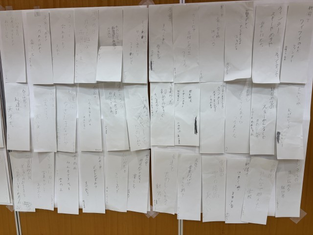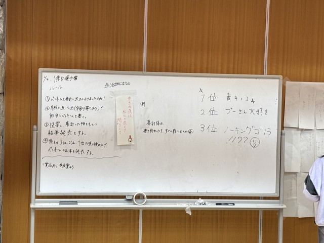 レクは俳句大会でした。ウインタースクールを振り返り、思い出たくさんの俳句を詠みました。みんなの投票で1位から3位まで発表しました。校長賞も発表しました。