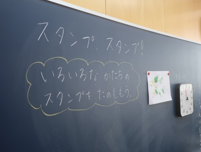 いろいろな形をいろいろな色を使ってスタンプしました。自分の手を使ってのスタンプは大盛り上がり。手に絵の具をぬって、たくさんスタンプして楽しみました。