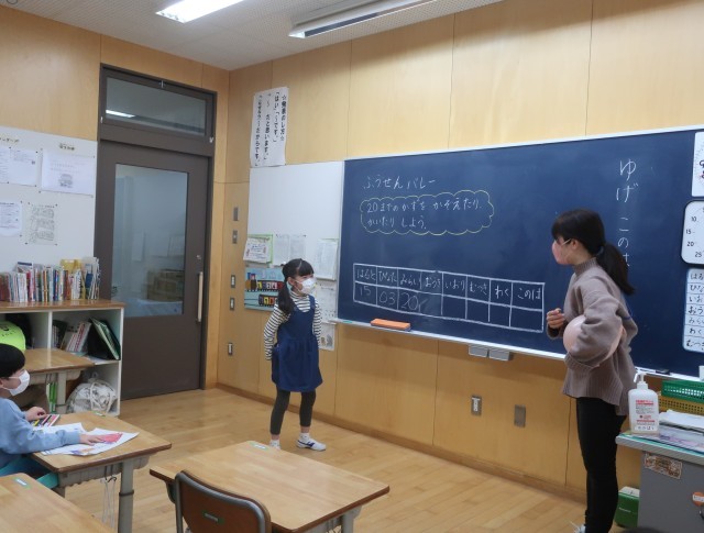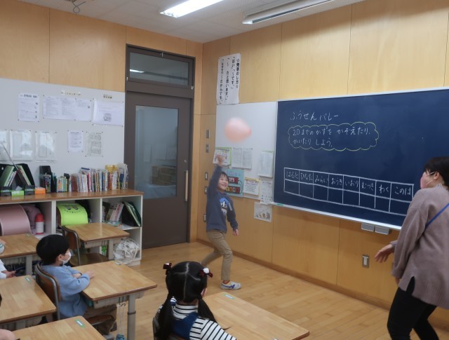 20までの数を風船バレーで数えます。「1,2,3・・・。」20までラリーを続け、途中で終わってしまったら、いくつなのか数字を黒板に書きます。みんな、20まで声に出して数えて風船バレーをしました。