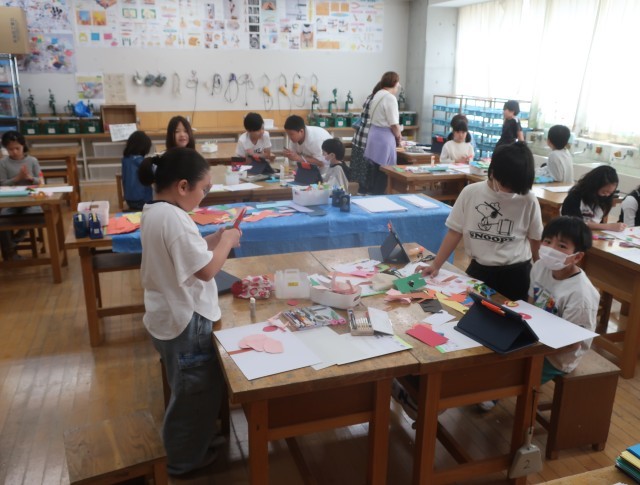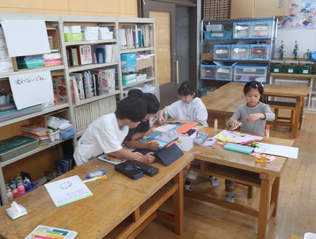 春を表すように、画用紙や折り紙を切ったり貼ったりしています。春を貼るという語呂合わせもすてきな題材で、華やかな作品ができあがりそうです。
