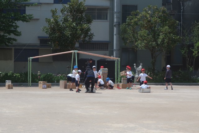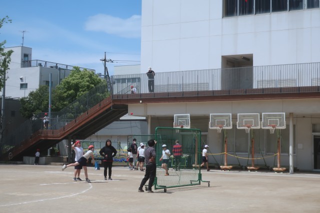 わかば学級は、みんなで体育の学習を行います。今日は、校庭でボール投げを行いました。学年の発達段階に合わせて、いろいろな用具を使って、ボールを遠くへ投げることができるよう取り組みました。風が強くなって、ボールを投げることが大変でした。