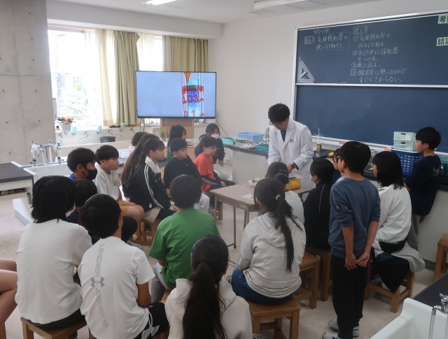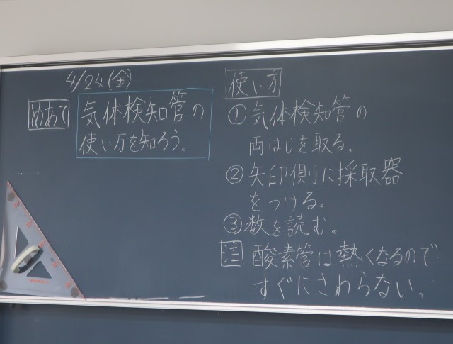 気体検知管の正しい使い方を学習しています。目に見えない、空気を検知する器具なので、正しい使い方をしないと結果が表れません。実験は、正しい方法で行うことで結果が表れます。