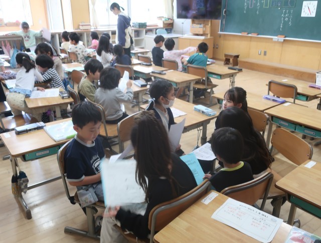 2年生が1年生を案内して学校たんけんを行います。今日は、顔合わせです。それぞれ自己紹介をしてお名前を覚えます。2年生が1年生をやさしく教えてくれています。