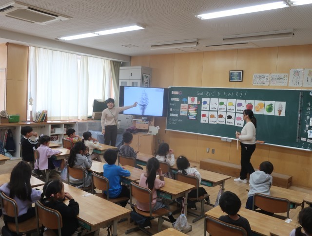 「躊躇なく英語を話す子供」を目指して、江戸川区全体で取り組み、本校でも1年生から英語に親しむ時間を設けています。さっそく、1年生の外国語活動の学習が始まっています。英語との楽しくふれることができるよう、いろいろな工夫をしています。