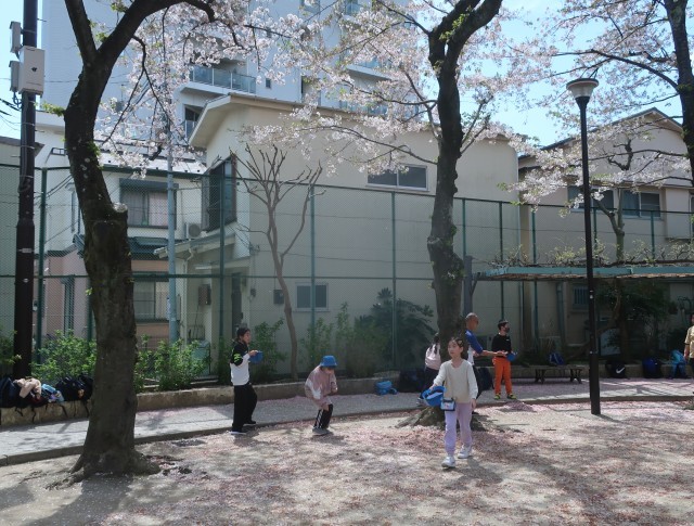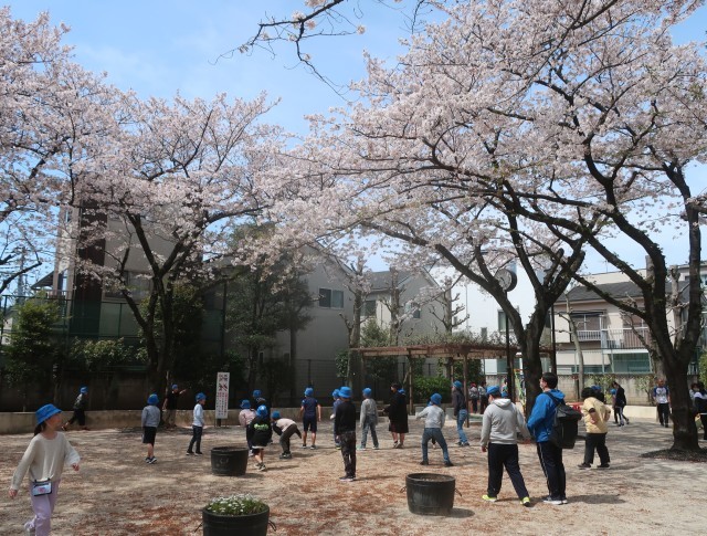 公園では、遊具で遊んだり、はじめの一歩をしたり、みんなで楽しみました。桜の花びらが風に吹かれてひらひらと舞い、花びら集めができた歩行学習でした。