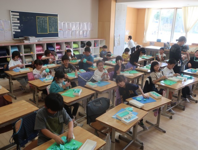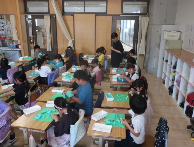 ねんどを使って、いろいろな形を作ります。ねんどをこねたり、ちぎったり、くっつけたりしながら、想像して作っています。どんな形や想像したものができたかな。