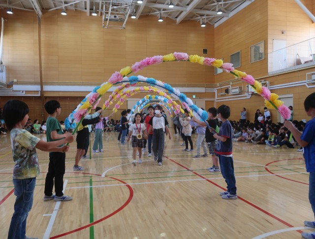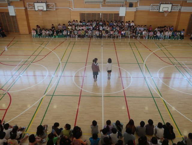 1年生を迎える会が始まります。6年生のお兄さんお姉さんとてをつなぎ、とびっきりの笑顔の1年生が入場してきます。さあ、1年生を迎える会の幕開けです。