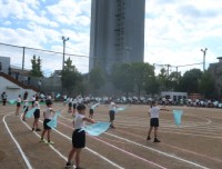 3年生の琉球ダンスのウエーブの練習です。曲間にウエーブをするタイミングを何度も挑戦しています。短い曲間でウエーブをきれいに行えるよう、タイミングを計っていました。