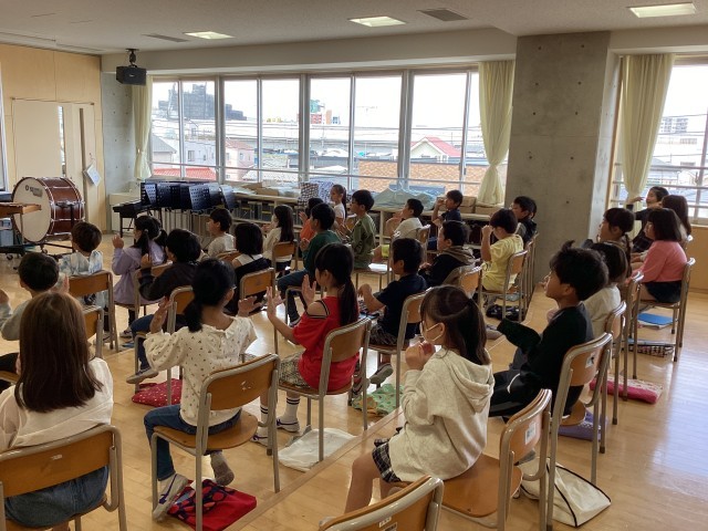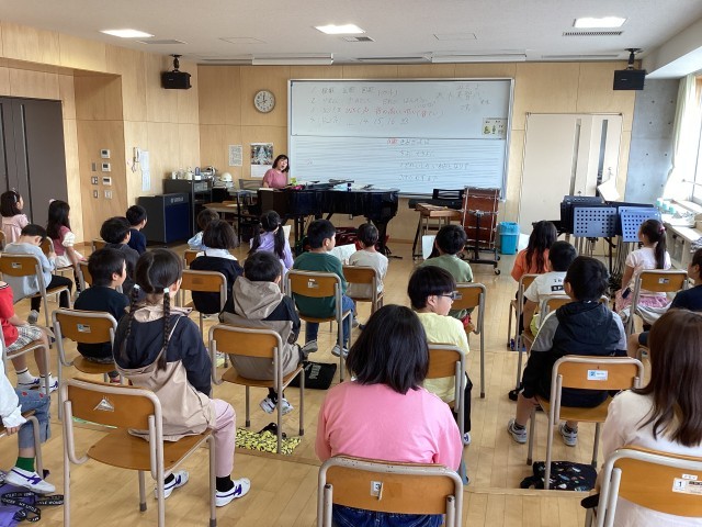 音楽室では、校歌や区歌を伸び伸びと歌ったり、リズム打ちをしたりして学習しています。