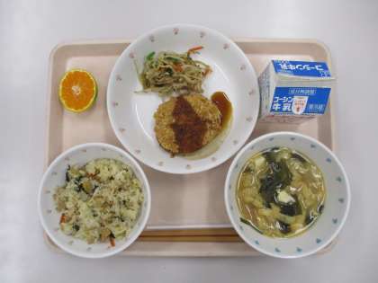 小松菜ご飯 牛乳 里芋コロッケ もやしのおかか和え えのきのみそ汁 みかん