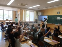 廃材で作った車が動き出します。不思議ですね。実は、風を送って動かしています。風で動くためには、軽くしてあげるとよく動きます。動く車を作って、みんなで風を送って車を動かしました。