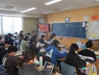 北海道は、平均気温が東京と比べて低く、冬は最高気温が0度に満たない日もあります。降雪量は、東京よりはるかに多く、雪と寒さの中での生活をしています。このような寒い土地に住む人々は、どのような暮らしをしているのか、学習問題を設定しました。みんなの疑問をタブレットに入力して、キーワードをAIが導き出してくれます。