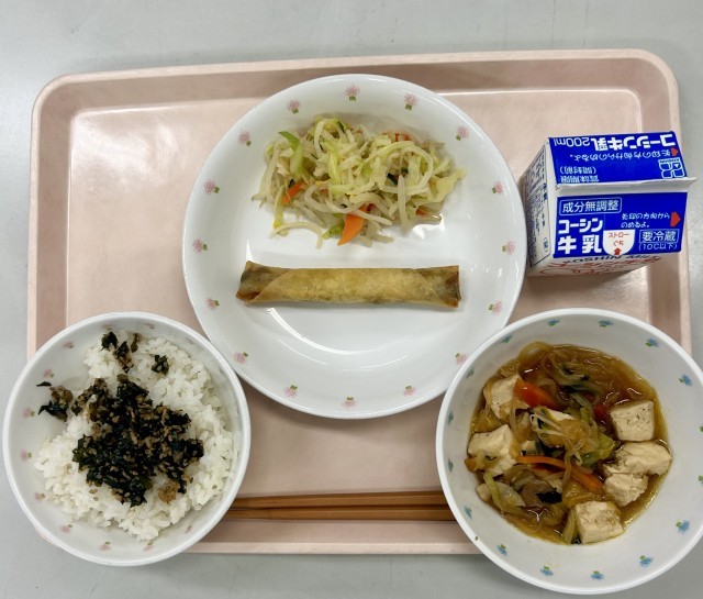 ご飯わかめそぼろししゃもの包み揚げはりはり和え肉豆腐牛乳