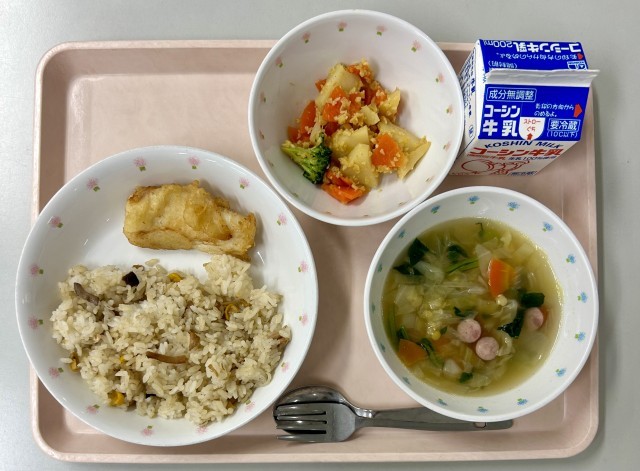鶏ときのこのピラフ牛乳イカのカリカリ揚げアーモンド入りカレーポテトサラダキャベツ...