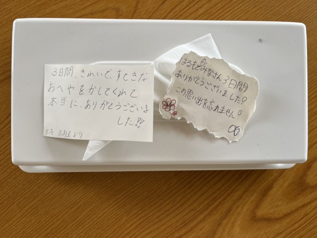 宿舎春茂登を出発する前、お部屋を確認したら、すてきな置きみやげがありました。こん...