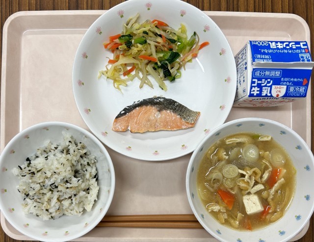 〈給食週間〉わかめご飯牛乳鮭の塩焼き野菜のもみ漬豚汁