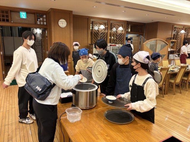 食事係が夕食の準備をしています。雪遊びをしておなかがすきました。魚沼産のコシヒカ...