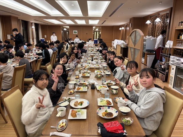 1日目の夕食です。コシヒカリのおいしさに食が進みますね。たくさん食べいます。