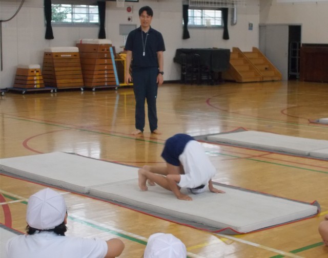 マット運動をしていました。前転のあと、後転の練習をしていました。手の位置に気を付けて練習するようにと先生が見本を示していました。