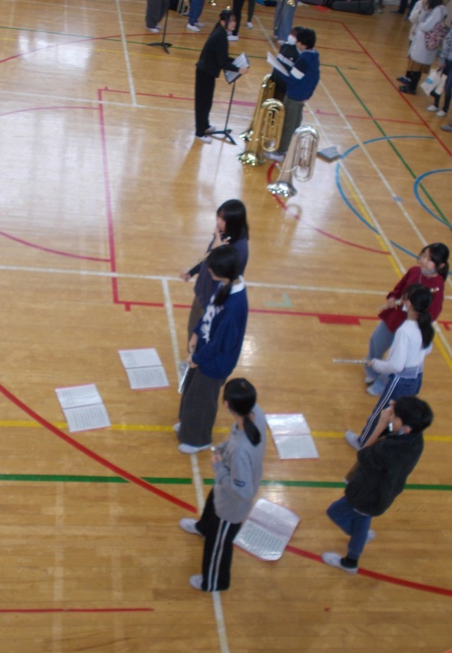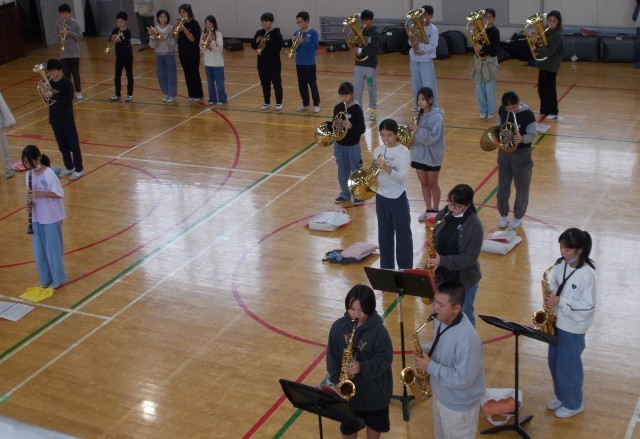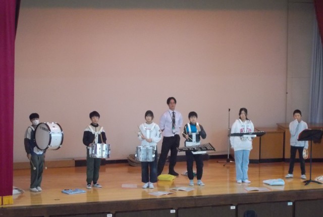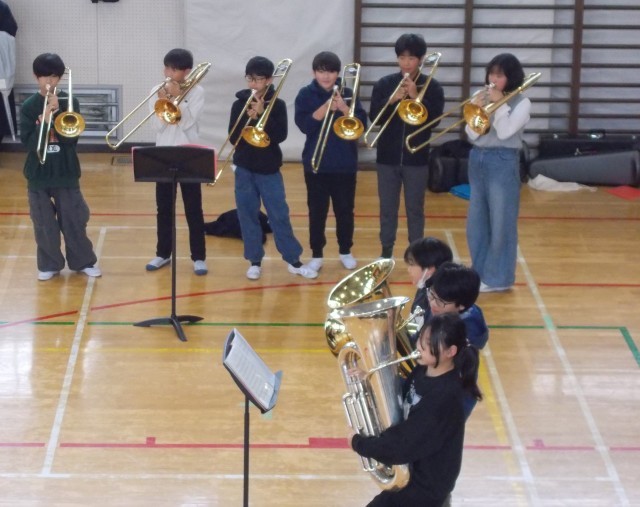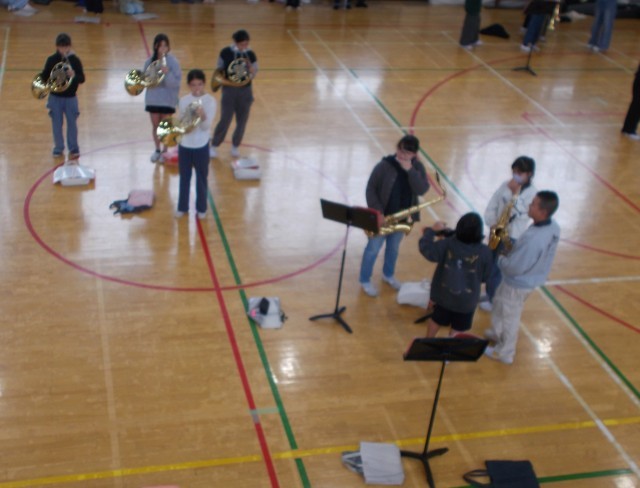 学校公開の3時間目、体育館にて、6年生全員ブラスバンドを披露しました。それぞれパートに分かれて練習していました。短い時間でも、先生の細かなアドバイスでよくなっていくのがわかります。
